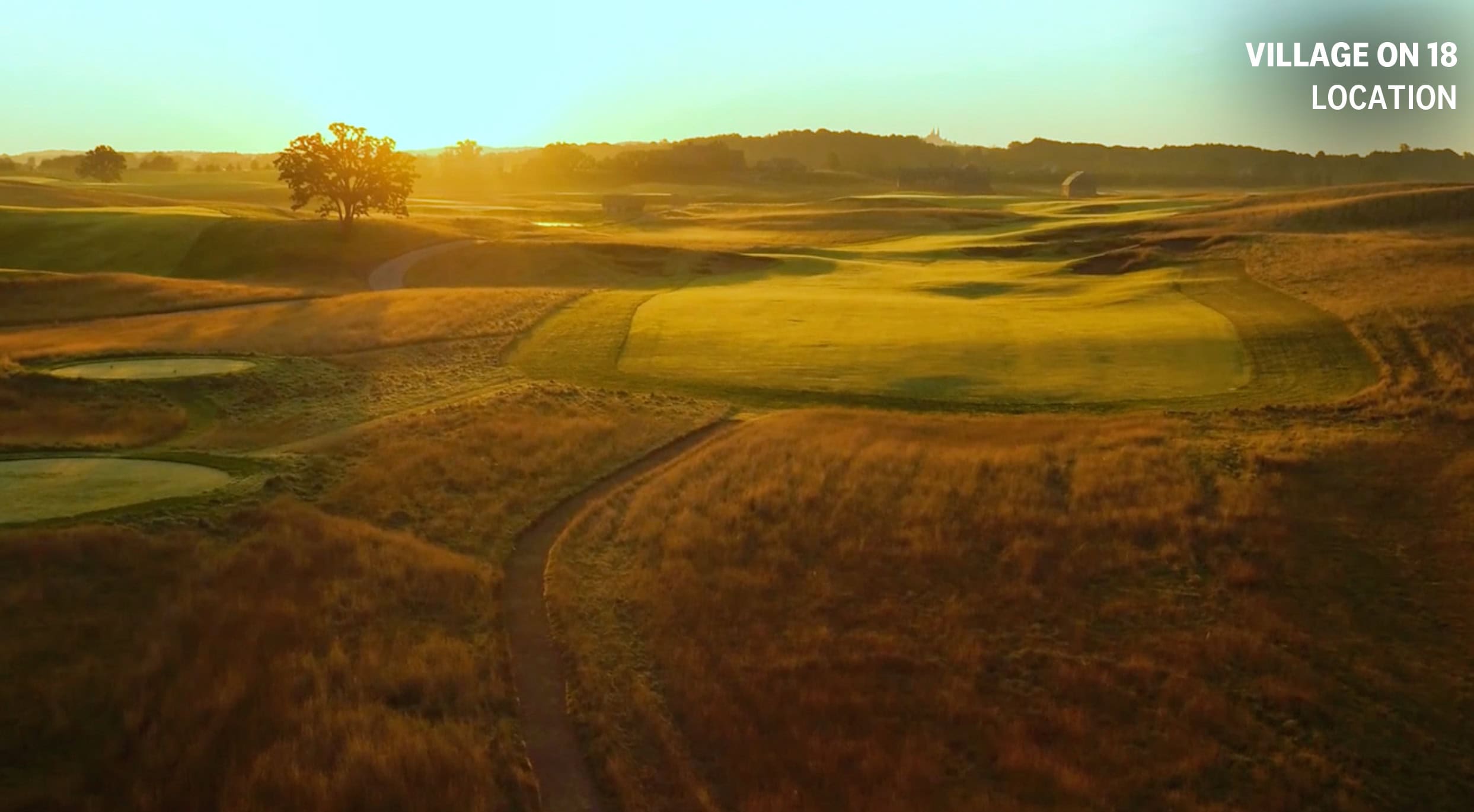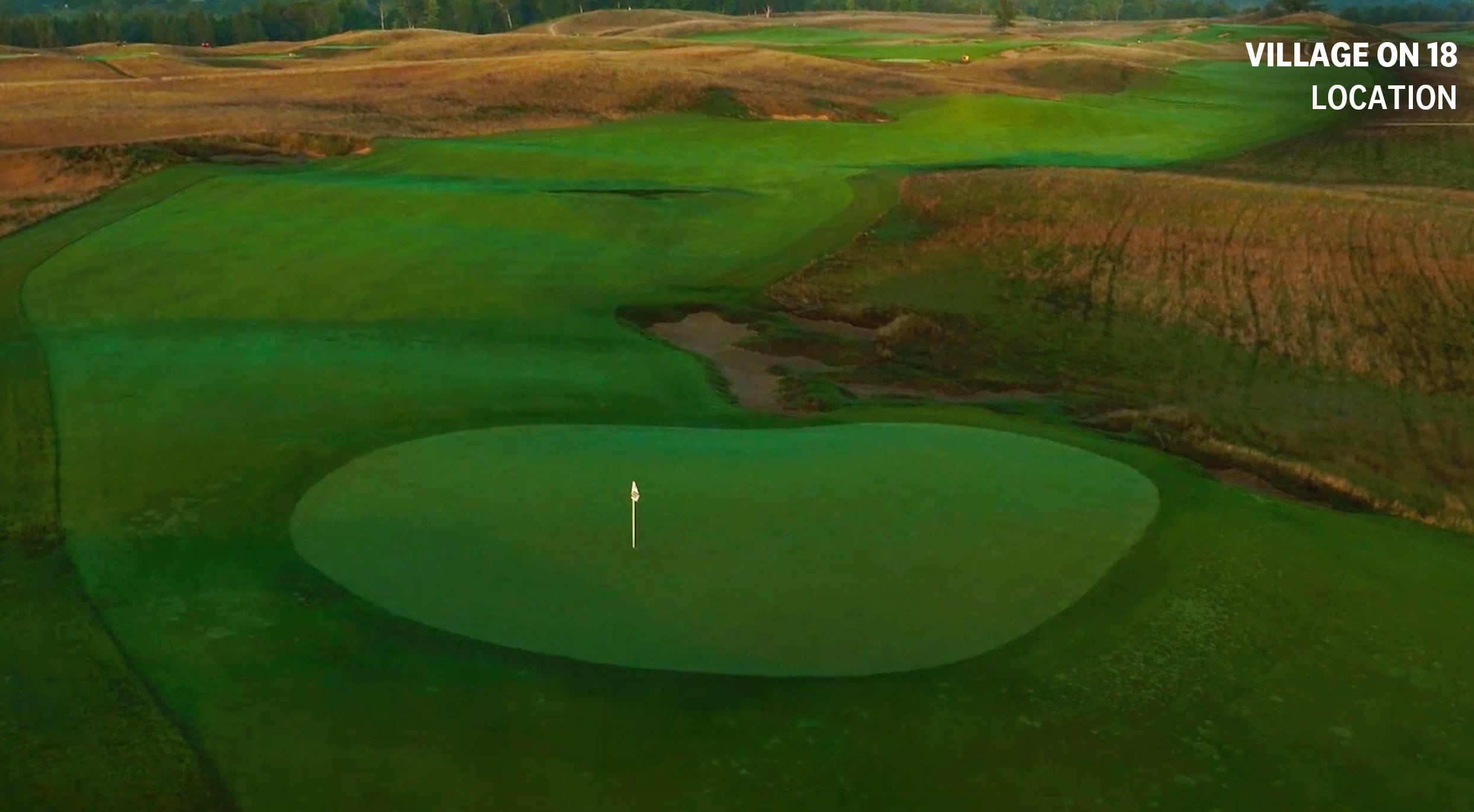 Erin Hills closes with a long par 5 that lines up with Holy Hill in the distance. The cluster of bunkers just short of the green will provide challenges for the players and excitement for the fans.